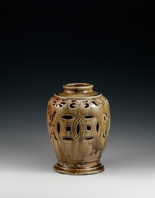 雙錢寶瓶 雙錢寶瓶是林添福挑戰自我極限的創作形式之一。整件作品由三個拉坯部件組合而成, 分內、外層瓶體,以及底部外翻的瓶足。瓶身以蝴蝶,壽桃,雙錢等吉祥花紋裝飾,且在超高溫柴燒1500度以超越陶瓷極限,呈現寶石礦玉的質地。鏤空仍能完好如初,無任何拉裂現象,技術難度極高,堪稱難能可貴的力作。 語音導覽-雙錢寶瓶