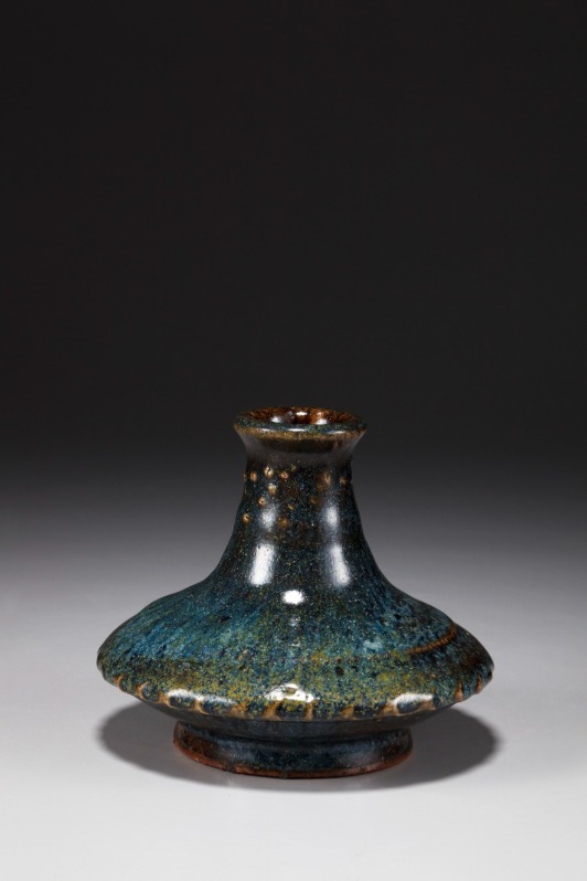 海藍小長景瓶是由晚年的林添福創作,他將長景瓶縮小成迷你版,採用拉坯技法一次完成寬闊的飛碟型瓶身,在壓縮翻轉後,拉出長景瓶的造型,展現出他獨特且精湛的拉坯工藝。作品的藍中帶白釉色以天然稻殼灰為基底,經過高溫柴燒,呈現出自然的藍白漸層色澤,為柴燒界罕見的灰釉質感。