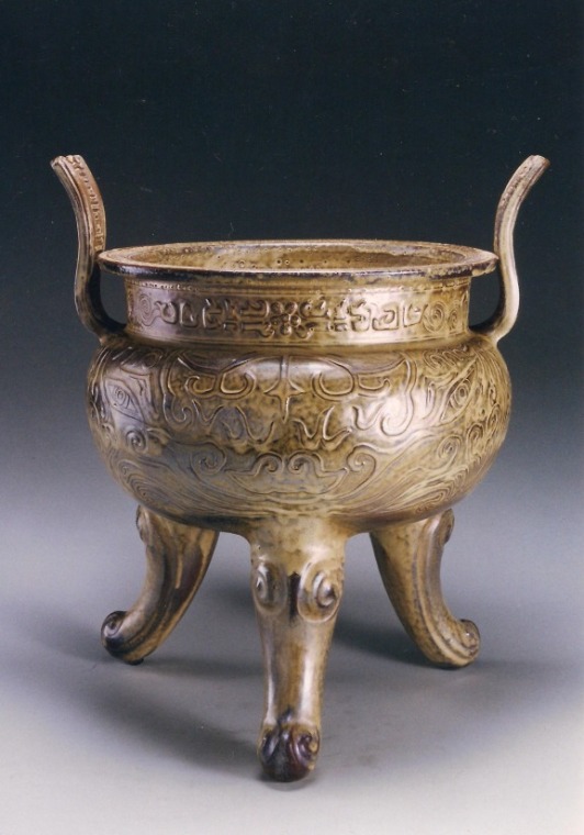香爐表面裝飾則結合多種技法——唇口飾以林添福親自製作的滾輪壓紋,細緻勻稱,爐身紋飾則參考故宮藏銅器的饕餮造形,以淺浮雕技法雕刻而成。最後,施以當時最具現代感的金黃色釉,並以瓦斯窯高溫燒製完成。