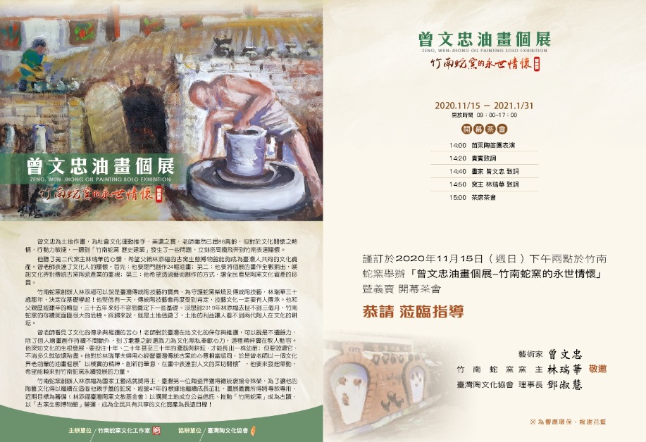 曾老師看見了文化的傳承與維護的苦心!老師對於臺灣在地文化的保存與維護,可以說是不遺餘力,除了個人繪畫創作持續不間斷外,到了耄耋之齡還戮力為文化無私奉獻心力,這種精神實在教人動容。他深知文化的生根發展,要投注十年、二十年甚至三十年的灌溉與耕耘,才能長出一株幼苗﹔但要毀壞它,不消多久就破壞殆盡。他對於林瑞華夫婦用心經營臺灣傳統古窯的心意相當認同,於是曾老師以一個文化界老前輩的油畫個展”以樸實的精神,創新的筆意,在畫中表達對人文的深切關懷”,他要來發起帶動,希望能喚來對竹南蛇窯的永續發展的力量。