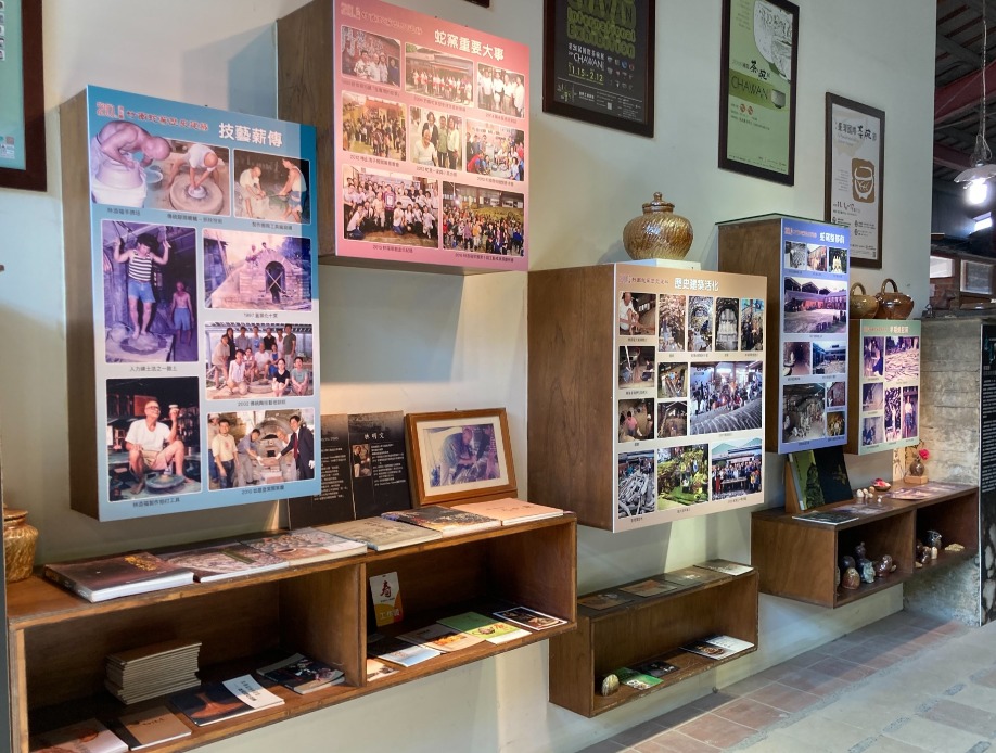 五個主題,分別為早期燒蛇窯、蛇窯整修前、歷史建築活化、蛇窯重要大事、技藝薪傳,濃縮轉型後28年來經歷的大小事。下方櫃則陳設文件資料,陶瓷與窯爐的歷史、文化資產、竹南蛇窯曾舉辦的展覽與書籍。