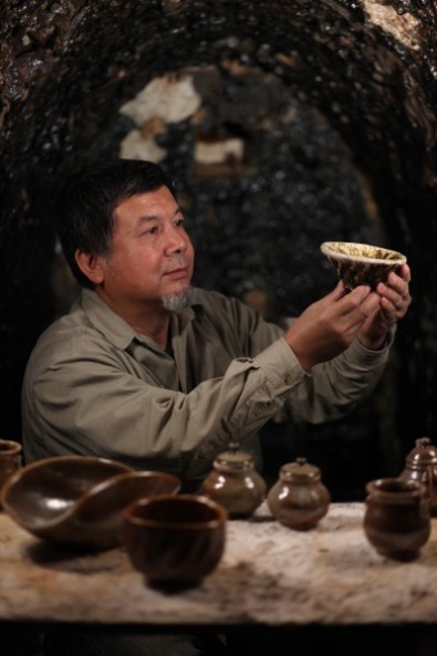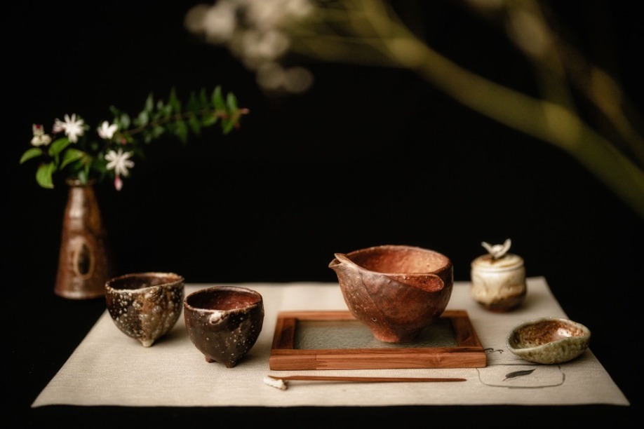 我的茶碗是用手捏法成形,手捏茶碗較容易辨識個人的風格,材料用礦土,親自手工練製,以掌握燒成溫度。我的燒法是用柴窯燒製,透過1400度至1500度之間的柴燒過程,形成自然的釉色,讓手捏茶碗形成有生命的作品。