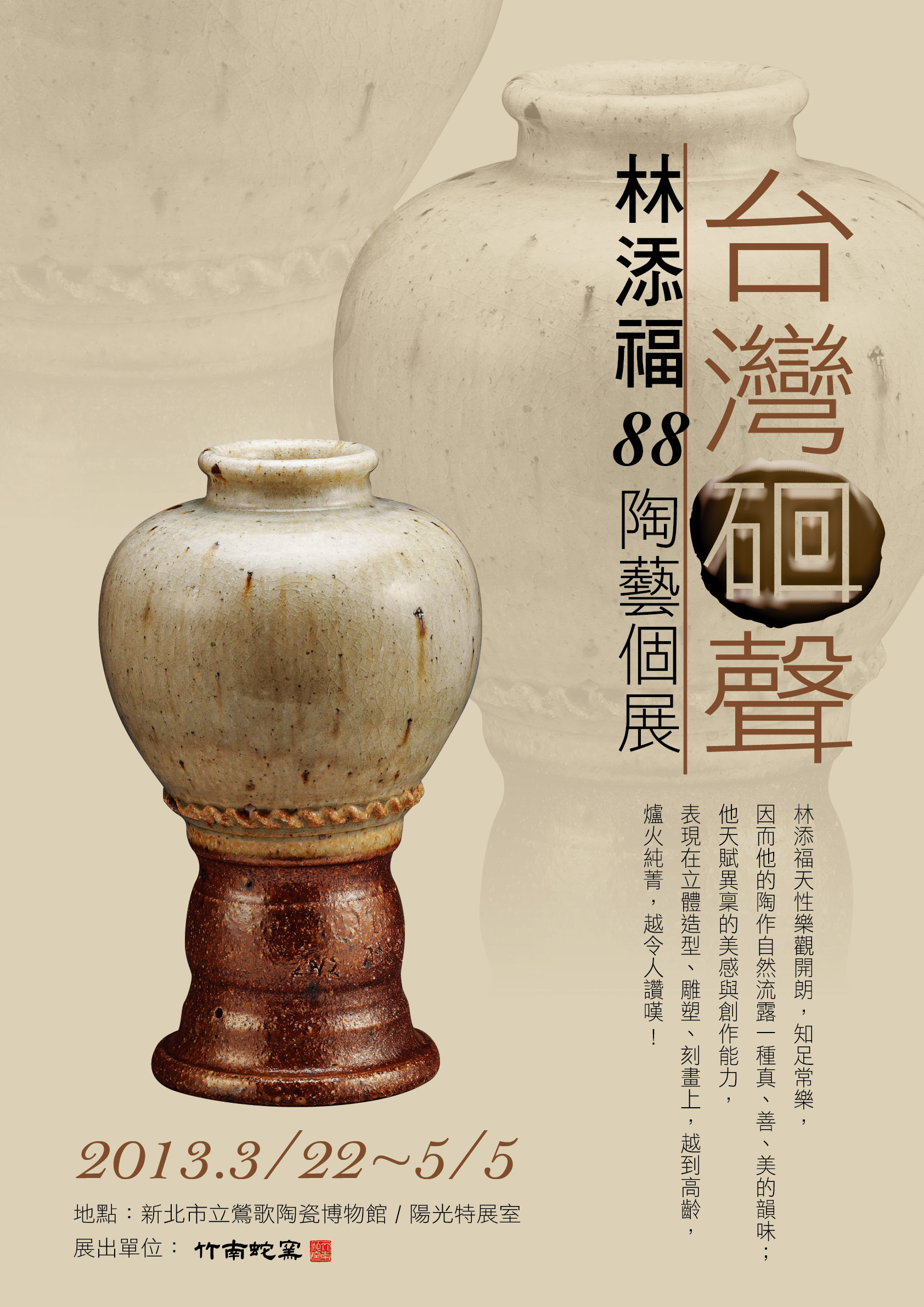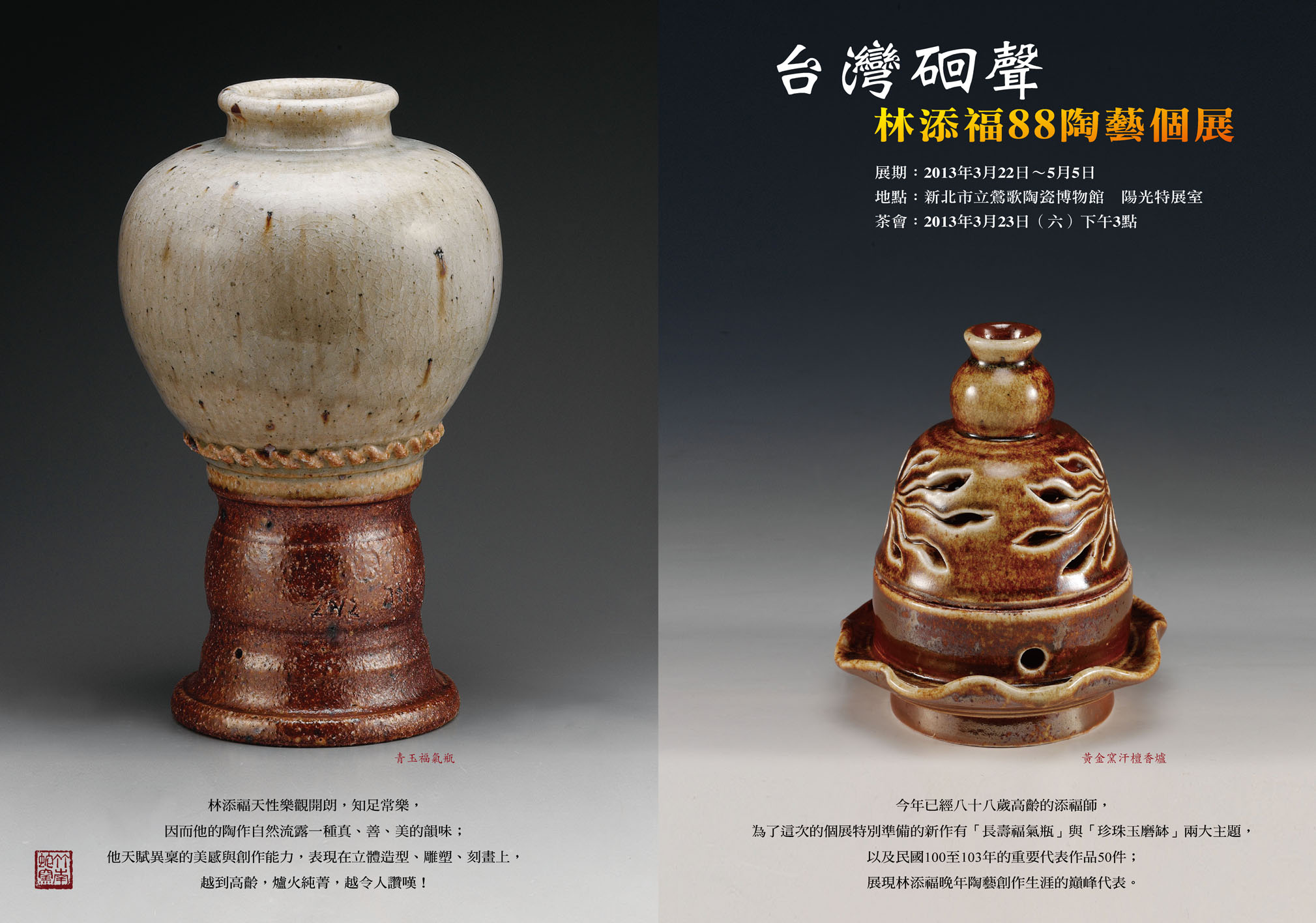 今年已經八十八歲高齡的添福師,為了這次的個展特別準備的新作有「長壽福氣瓶」與「珍珠玉磨缽」兩大主題,以及民國100至102年的重要代表作品50件;展現林添福晚年陶藝創作生涯的巔峰代表。