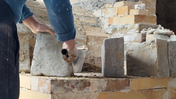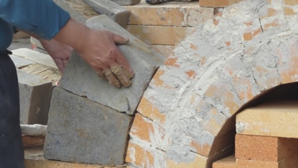 當砌築至最後一塊磚時,中央位置放入關鍵的土磚,此磚必須略大於最後的空間,以木板頂住最後一塊磚上方,用木槌慢慢敲打進去,完成後窯拱就「拱」起來了,撐起整個結構。
