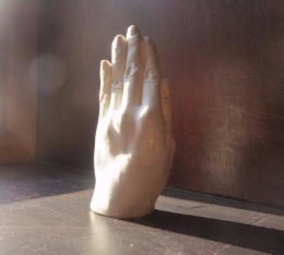 「工具」;則是我為12位朋友先在香港用石膏翻模,為每人做了一隻手的模型,再用注漿的方式,為他們製作一隻陶手。這幾位朋友都已經認識了一段時間,共度許多時光,他們陪我度過不愉快的日子,也分享我的喜樂。別的陶藝家駐村時可能會帶著他們自己的工具,如修坯刀、木刀等等,我帶的是心靈的工具——這12位朋友的陶手。藉由這些朋友的手,我在駐村期間時時感受到他們的支持。