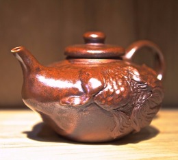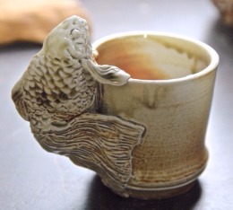 他的作品有許多浮雕金魚、龍,立體捏塑的鳥類、人物,彩繪人物、魚盤,這次也特別從日本帶來幾件比較現代感的生活陶作品請大家欣賞。特別是浮雕金魚更是他的拿手絕活,為了雕塑金魚,上村先生花了很多時間觀察金魚,所以他所雕出的金魚彷若就是優游在水中,而這次來台也是他第一次體驗超高溫柴燒,竹南蛇窯特有的高溫柴燒落灰,更是將上村先生的金魚點綴得栩栩如生。